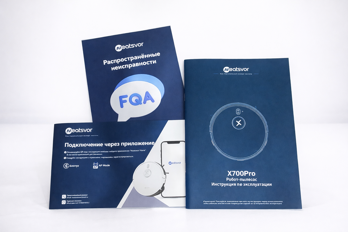 Отдельно хотим отметить, что вся документация к роботу-пылесосу Neatsvor X700 Pro полностью переведена на русский язык. В комплекте идет подробная и понятная инструкция, где пошагово описаны первый запуск, подключение к приложению, настройка карт, режимов уборки и ухода за устройством.