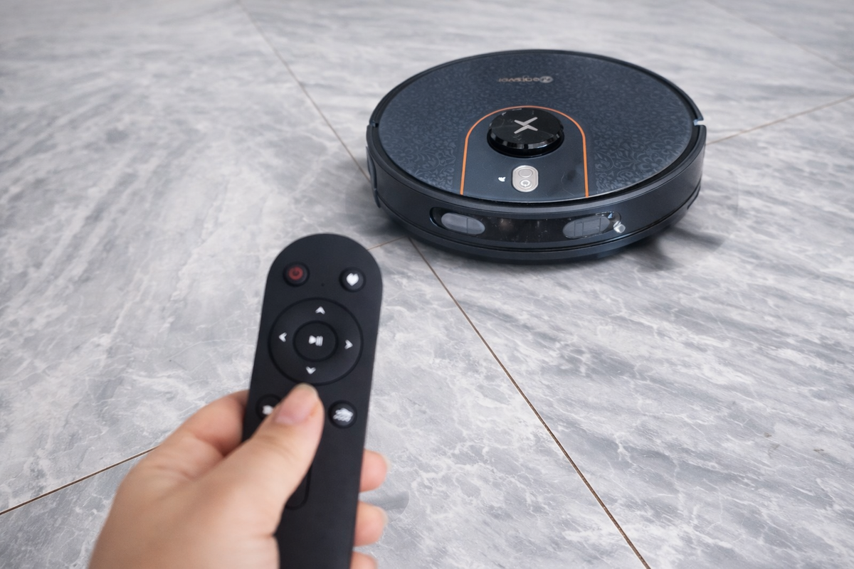 С пульта доступны запуск и остановка уборки, принудительное возвращение робота на зарядную станцию, ручное управление движением, старт/пауза, режим интеллектуальной очистки, точечная уборка, а также настройка мощности всасывания и уровня подачи воды.