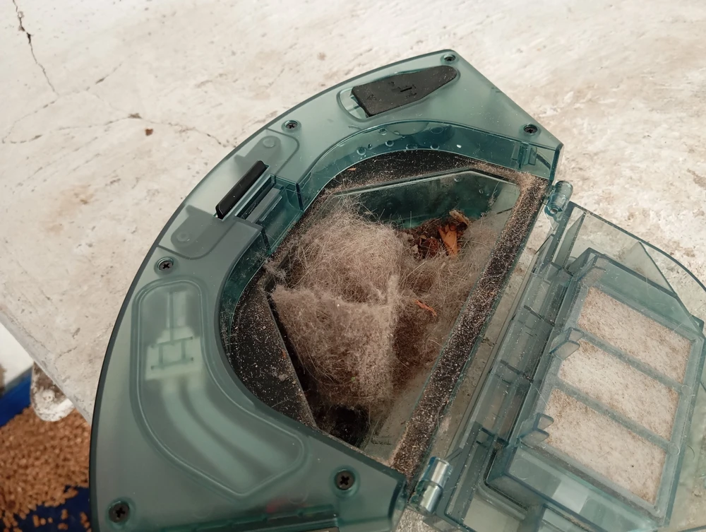 На практике четко видно, как робот увеличивает мощность всасывания на коврах, собирая шерсть кота и мелкий мусор, который обычный ручной пылесос иногда оставляет. При этом шум остаётся умеренным: тихий режим почти не мешает, стандартный — заметно, но терпимо, а максимальный уровень всасывания, несмотря на мощность, не производит ощущения «разрушительной техники», а работает ровно и стабильно.